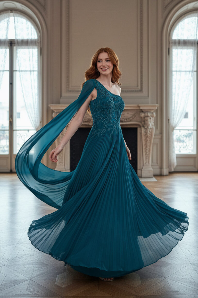 Abito lungo scenografico dal design raffinato, realizzato in una profonda tonalità verde smeraldo. Il modello monospalla è impreziosito da un elegante manica lunga che segue il movimento dell’abito con leggerezza, creando un effetto etereo e sofisticato.