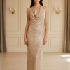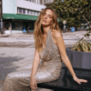 La linea ĆØ aderente e slanciata, segue le forme del corpo fino a terra creando una silhouette sinuosa e sofisticata. Il colore oro champagne lo rende perfetto per eventi serali, feste e cerimonie dove ĆØ richiesto un look d’impatto.