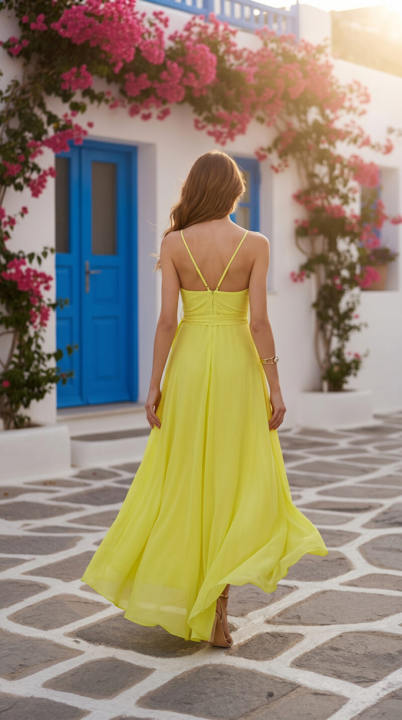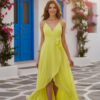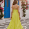 Abito lungo in una luminosa tonalità giallo limone, perfetto per cerimonie primaverili ed estive. Il modello presenta spalline sottili e uno scollo a V incrociato che valorizza il décolleté con eleganza.