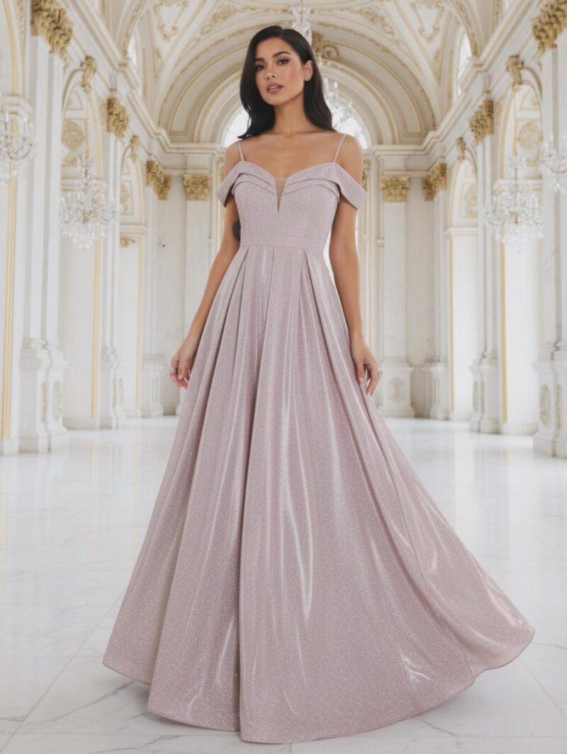 Abito lungo dal fascino principesco realizzato in tessuto luminoso effetto glitter, capace di riflettere delicatamente la luce ad ogni movimento.